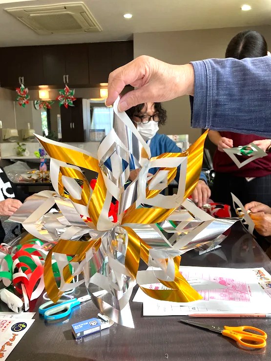 本日は『みんなで折り紙』~折り紙で脳を活性化~と題し、小規模多機能ホーム ケアポート晴寿 石隈さんよりクリスマスリース作りをしていだだきました。「折り紙がこんなに楽しいとは思わなかった。何十年ぶりだろう」「集中できたよ~」「今日ははなまるでした!」等お声をいただきました。