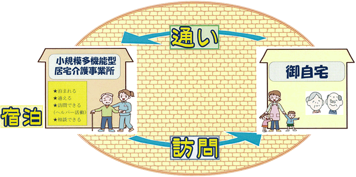 通いを中心とし、利用者様のご希望や必要性に応じて、随時宿泊や訪問サービスを提供いたします。